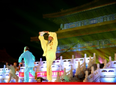 圖8 助演嘉賓——男女雙人太極拳全國(guó)冠軍的精彩表演。所有以武術(shù)為元素的節(jié)目,都有一個(gè)共同的特點(diǎn),那就是人的,飽滿的精氣神兒!