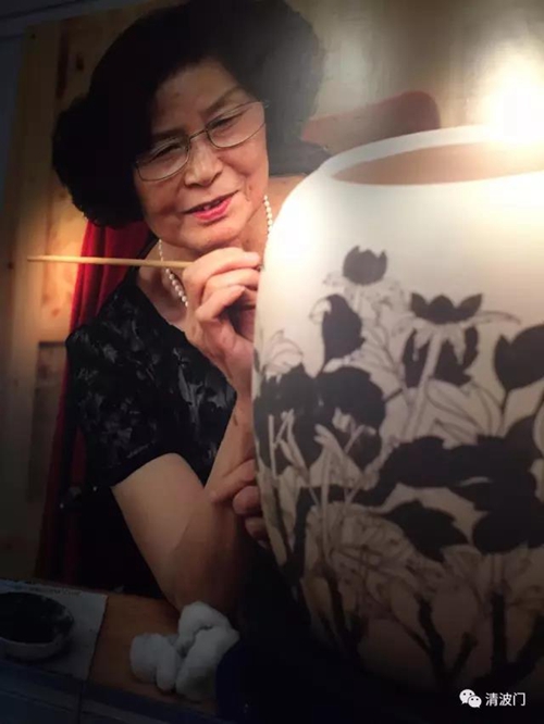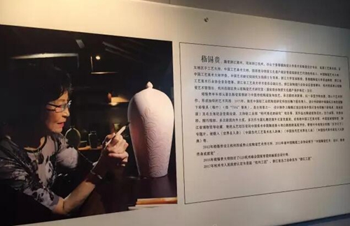 這一切得益于嵇錫貴大師的藝術人生經歷。畢業于景德鎮陶瓷美術技藝學校和景德鎮陶瓷學院美術設計系。23歲即進入輕工業部陶瓷研究所藝術室工作。44歲調入浙江省工藝美術研究所,潛心研究越窯、南宋官窯、龍泉窯、婺州窯青瓷、長興紫砂陶器的燒制技藝和裝飾技藝。這兩段主要經歷,體現在她的作品上。一塊是明清景德鎮綜合陶瓷技藝風格,另一塊是浙江青瓷尤其是越窯青瓷技藝的恢復與創新。
