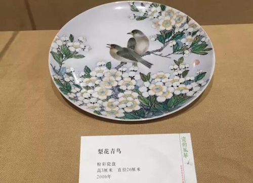 我個人而言,尤其喜歡下面這件“梨花青鳥”粉彩瓷盤。類似風格另一件《梨花小鳥溶溶月》粉彩瓶被嵇錫貴大師之女,藝術學博士郭藝研究員,評論為“母親五十歲之后淡泊恬靜風格的代表性作品,是她對于人生的深刻感悟與表達,使人進入作品悠遠的意境之中。讓人不再關注工藝技法,而是更多地引發對生命的反思”。