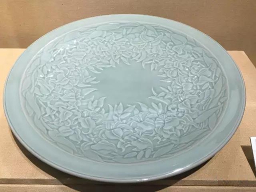 第二個感受,大師刻花工藝的纏枝花卉,鮮活靈動。以這件“暗香浮動”越窯青瓷刻花大盤為例。圖錄上的照片,無法表現出纏枝花卉的舒展與層次感。你若見過南宋都城杭州出土的唐五代越窯青瓷精品標本,再來看大師的作品,就會由衷感嘆大師刻花技藝出神入化。