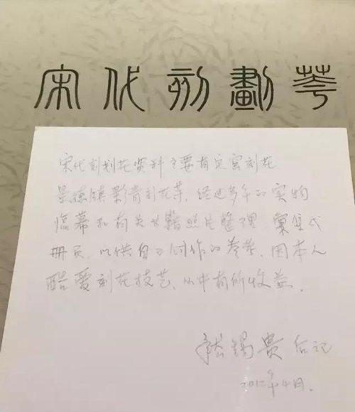 展覽上,我特別注意到嵇錫貴大師的一紙鉛筆字。“宋代刻劃花資料主要有定窯刻花、景德鎮影青刻花等。經過多年的實物臨摹和有關書籍照片整理、匯集成冊頁,以供自己創作的參考。因本人酷愛刻花技藝,從中有所收益。嵇錫貴后記 2012年4月”。大師何能成為大師?可見一斑。