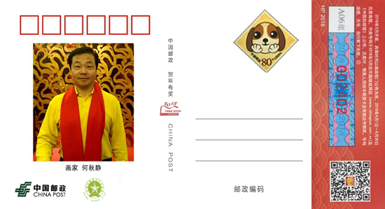 為紀念中華人民共和國黨的十九大勝利召開,迎接2018年的到來,中國郵政出版發行實力派書畫家何秋靜先生有獎明信片,明信片內容包括個人肖像、藝術簡歷和國畫作品,較為全面地展現了何秋靜先生獨特的藝術面貌。