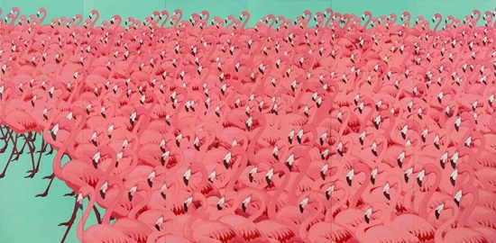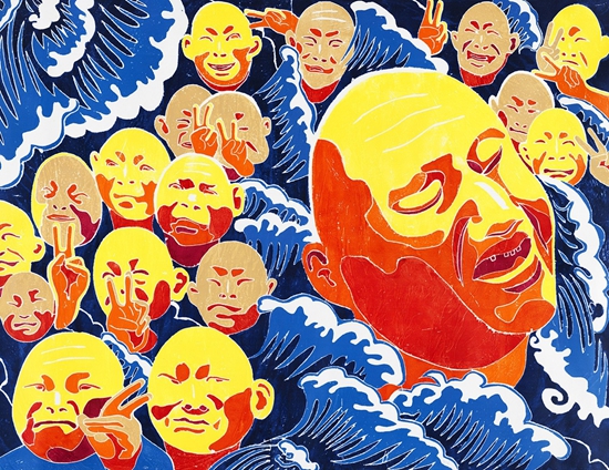 個人化的創作自由可以構成一個藝術事件,從個人的變化中,同樣可以覺察到一種歷史性的轉向。無論是藝術史還是評論界,方力鈞已經成為了一種時代性的文化現象,單一的、非個性化的人群關系,以及在這樣的群體中的個體消逝和無奈,是他長期突出表達的藝術主題,在他的作品中藍天、白云、鮮花的背景中混雜著手槍、昆蟲、飛禽…等各種沖突的元素,即荒謬又真實,既美好又殘酷。方力鈞學版畫出身,他一直期望在版畫上有所突破,版畫尤其木刻,歷來適合制作小品,諸如書籍插圖之類。而方力鈞的版畫追求完整的獨幅創作,以及尺幅的巨大和視覺沖擊力。巨大而能持刀法的流暢自如,是方力鈞木刻版畫的技術難題,也是方力鈞在版畫制作上的貢獻。他使用工業電鋸等工具,因此刀法顯得格外鋒利、強悍、霸道和氣派,迥異于傳統木刻刀的細膩和纖巧,而具有一種工業工具般的力度,正是這種工業工具帶給作品刀法的力度。使他的版畫系列作品,迥異于油畫無筆觸感——使形象突出而不是油畫味道的突出,迥異于水墨畫的非筆墨性特性——淡然浪漫中的無奈,而方力鈞的版畫則把他體驗到的人生無奈無助表現得更強烈,也是方力鈞作品中較少有的悲愴感覺。