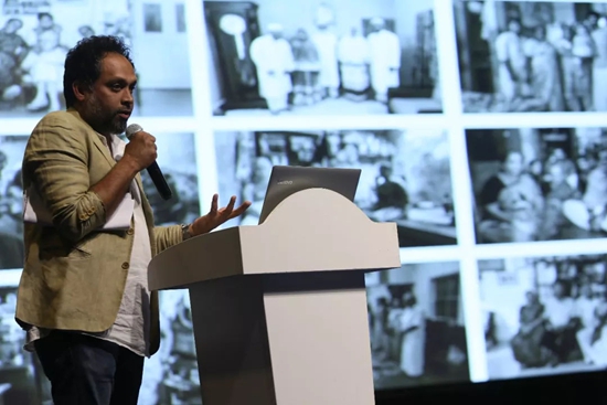由印度科欽穆吉李斯雙年展的項目總監(jiān)瑞亞斯.柯姆做演講,他演講的題目是“作為社會行動的雙年展”。首先他介紹了一下印度的總體情況以及克拉拉邦的社會變革,在這樣的背景下如何為雙年展做出貢獻是值得思考的問題。他提倡注重人類本身,認為人作為一種遺產(chǎn),能夠不斷的給雙年展提供很多的想法與靈感,并且希望能夠?qū)⑦@些工業(yè)空間真正作為一個人們可以朝圣的地方,讓人們能夠很好的記錄下一些寶貴的記憶。