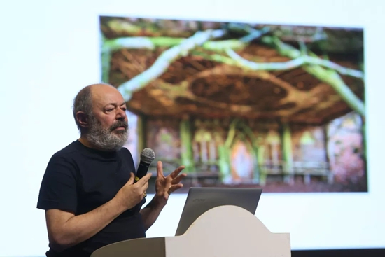 最后一位發(fā)言嘉賓為米蘭新美術(shù)學院和多莫斯設(shè)計學院科技總監(jiān)伊塔洛·羅塔,他從一個科學的角度來看待人和自然的一個關(guān)系,包括人的創(chuàng)造能力和潛在的創(chuàng)造潛意識,并從他獨特的視角來介紹一些藝術(shù)和建筑案例,以此來揭示未來學習的一個方式。而藝術(shù)的重要性就隱藏在未來極端的形式里面,這種“極端”從人際交往、溝通渠道、知識的來源的過程中都可以看見。