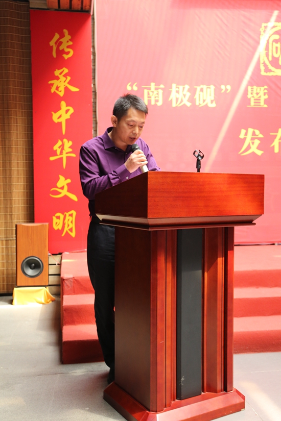 常務副會長張國興就“南極硯”及“一帶一路硯”有關情況作了介紹。本次“南極硯”暨“一帶一路硯”發布會,是中華炎黃文化研究會硯文化委員會自2012年以來陸續推出“飛天硯”、“蛟龍硯”、“南、北極硯”、“一帶一路硯”等系列中華名硯的大匯聚。2012年中華炎黃文化研究會硯文化委員會設計制作的“飛天硯”隨“神九”上了天;2014年又設計制作“蛟龍硯”隨“蛟龍號”下潛5200米深海,實現了中華硯臺上天、下海的歷史壯舉。黨的十八以來,黨中央制定出建設社會主義文化強國戰略,習近平總書記提出大力弘揚中華優秀傳統文化創新性發展指示精神。為積極響應和貫徹落實黨中央和習總書記號召,2017年,硯文化委員會以中國特色社會主義文化創新發展主題,開展了“南、北極硯”與“一帶一路硯”的研發創作。