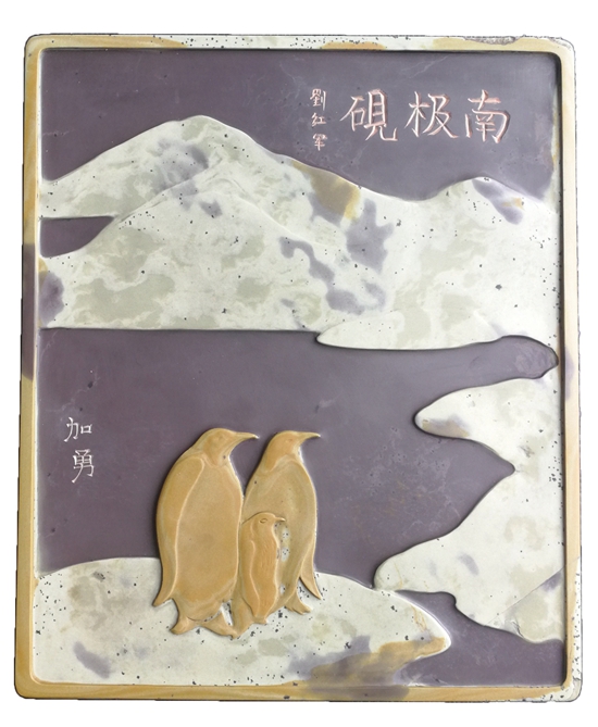 “南、北極硯”由中華炎黃文化研究會硯文化委員會名譽會長劉紅軍題銘,中國工藝美術大師曹加勇設計制作的兩方苴卻石硯。之前,在國家海洋局極地考察辦公室大力支持和協助下,“北極硯”已于2017年8月25日隨中國極地科考隊成功抵達北極中國黃河站,完成了在北極的任務,8月31日順利返回北京,并于2017年12月28日在北京舉行了發布會。繼“北極硯”之后,“南極硯”于2017年11月8日隨國家海洋局第三海洋研究所第34次南極科考隊搭乘“雪龍號”科考船成功抵達南極,完成了在南極的活動,于4月21號順利返回祖國。至此,圓滿實現了中華硯臺首次到達地球兩端——南、北極的歷史壯舉。“南、北極硯”是繼“飛天硯”、“蛟龍硯”之后,又一具有里程碑意義的中華名硯。發布會后,“南極硯”交接中華硯文化展覽館,將與“飛天硯”、“蛟龍硯”和之前的“北極硯”一并陳列展出。