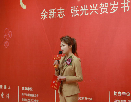 開幕儀式由北京電視臺著名主持人蘇琳主持,她首先介紹了參展兩位藝術家,余新志先生又名新治、洲山,字翔海,原本皇室貴胄,1941年10月出生于四川樂山。為中國沫若書畫院終身院長,中國陶行知教育基金會藝術總監,蘭州大學、西南交通大學美術教授,中國詩書畫院、中國當代書畫藝術研究院名譽院長,徐悲鴻畫院、世界名人中心藝術顧問,中國歷史博物館藝委會委員,國家一級美術師;英國皇家藝術研究院院士。張光興是著名文化學者、美學家、書法家,字大拙(又作大卓),1950年6月出生于山東桓臺,畢業于南開大學經濟學系。先后擔任淄博教育學院院長、淄博師專校長、山東工程學院黨.委副書.記、青島理工大學副校長等;現任青島理工大學教授、碩士生導師、大學生創業團隊導師,青島求實職業技術學院院長等。他是中國書法家協會會員、中華美學學會會員、臺北故宮書畫院終身客座教授以及山東高校書協藝術顧問、齊文化專業委員會主任委員等。