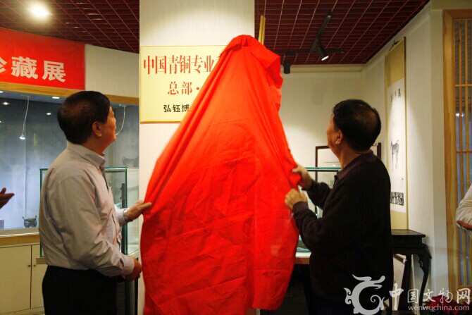 中國全聯(lián)民間文物藝術(shù)品商會會長宋建文(右)和中國青銅專業(yè)委員會會長賈文忠(左)為中國青銅專業(yè)委員會(總部·北京)揭牌