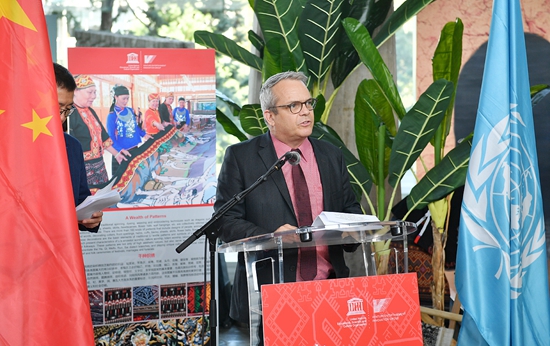 聯合國教科文組織總部活態遺產處代表Tim Curtis先生為開幕式致歡迎辭。作為聯合國教科文組織活態遺產處的主任,Tim Curtis 先生表示這次黎錦展覽展示了美麗海南島黎族傳統歌舞、游戲等豐富的文化遺產,特別是以黎族紡織為核心的黎族紡織,今年是傳統黎族紡織技術進入中國十周年。2009年列入聯合國教科文組織急需保護的非物質文化遺產名錄。對于本次海南省人民政府將這些來自中國的優秀文化遺產帶到巴黎聯合國教科文組織總部展出表示感謝。