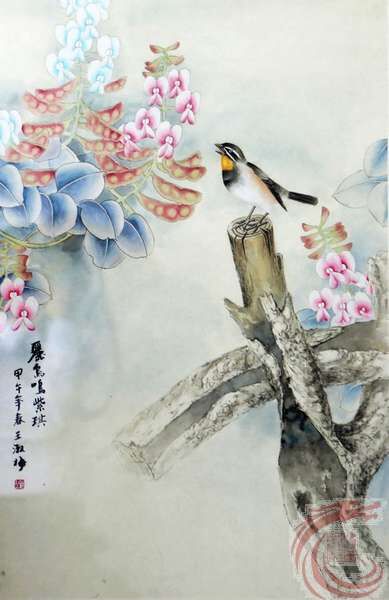 典雅清秀是王淑梅工筆畫作品的突出特點。我們知道,工筆畫之所以一直以來受到人們的普遍歡迎和喜愛,主要是其以典雅清秀、精謹細膩、清新明朗的風格占據藝術品欣賞力的重要位置。其中,尤其以典雅清秀的視覺感染力最為重要。因為,一幅工筆畫要想用畫面體現出這種風格,沒有一定的繪畫功力和深厚的藝術涵養,是很難達到這一欣賞的目的。而王淑梅的作品卻完美的包含了人們對這些審美欲望的因素。在王淑梅的花鳥畫作品中,典雅清秀的特色始終占據重要地位。通過她的作品我們還可以體會到,她是在溫馨自然情懷下,以明朗的繪畫風格創作完成作品的,這給許多愛惜她畫的人留下了深刻印象。讀王淑梅的作品,一種清晰、溫馨、愜意的意境令人流連。