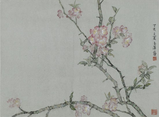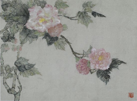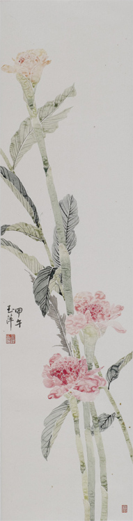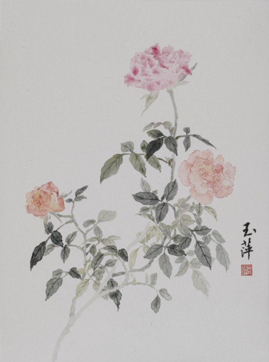 沒骨花鳥畫是中國傳統花鳥畫的一種畫法,它直接用顏色畫成花葉,而沒有“筆骨”,不用墨線勾勒的輪廓,直接用彩色描繪物象。這種畫又稱“沒骨畫法”。而王玉萍就是當代沒骨畫法的杰出女青年畫家。她在大量的實踐和探索中,尤其喜愛清朝初期著名畫家惲壽平的筆墨。惲壽平的“沒骨”花鳥畫吸引著王玉萍,她尤其喜愛惲壽平獨特的點花頭的筆韻:白花帶少許胭脂,點后再用胭脂渲染,這種渲染達到水汪汪、清而有神,超逸,格調高雅,特別有神采的藝術效果。