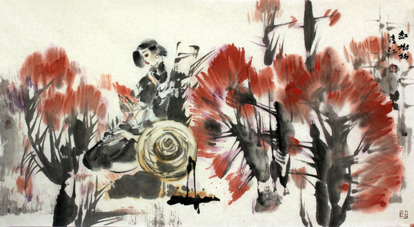 欣賞李江的畫作,首先撲入眼簾的是大片大片開的繁盛的花朵,譬如《紅樹林》、《荷深水風闊》、《春雨過后山色新》等人物寫意畫盡是將自然的繁盛用大塊的墨塊與色調呈現(xiàn)在畫面之中,乍看是大筆潑墨,實際上是用小筆書寫、壘加、積累渲染而成。雖是積累渲染,卻無墨色的暗沉,反之則多是光亮新顏。畫中人物則以三、兩筆輕描淡寫的繪出,卻似用盡心機、仔細擺布,人物的輪廓、形體姿態(tài),在筆墨書寫濃淡中分出,著些水墨漫漶一遍,然卻十分清晰。人物的面部、頸、手、衣紋等具體細微處用傳統(tǒng)線描方式在濃與淡、虛與實、線與面的對比中,引人入勝。