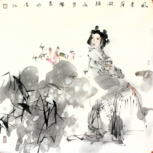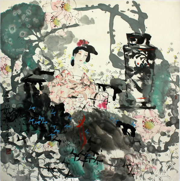 那對弈沉思的才女,那對花自憐的閨秀,那讀詩吹笛的少女,那獨坐賞花的少婦……瑩潤的,飄逸的,便這樣輕盈的從李江筆下款款流淌出來了。那不是復古,亦不是懷舊,更不是昨天的一簾幽夢。畫家力圖營構的是一個人與環(huán)境和諧自然的世界,有如明清文人筆下遠離塵囂的“桃花源”。無憂無慮,無煩無惱。仿佛這些淑女閨秀,悠閑地生活在一方理想的園林樓閣之中,癡情于琴棋詩畫,抒發(fā)風月幽思……。