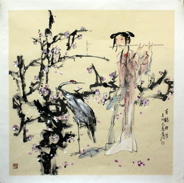 “詩意在言外,畫境在意中”李江用水墨的新描繪著東方女性特有的萬千氣質,與寫實人物畫相比更添了幾分遐想和自由的氛圍。在《有鶴相伴》一畫中,同樣是以女性題材來表達畫面主體的,卻配以仙鶴、梅花為大場景,似是由遠及近的靜靜觀賞。畫中襯景占據(jù)畫面的三分之二,在紅梅掩映之中一名女子亭亭玉立,輕啟紅唇吹奏一曲天籟之音,翩翩笑意嫣然臉上,身邊仙鶴靜立,似是聆聽女子用笛聲訴說的故事,抑或是為這天籟之音所吸引而停止前行。作品用筆細膩流暢,色彩搭配絲絲入扣,遙相輝映,將人的內(nèi)心與動物的感知融為一體,更與梅花之景相輔相成。