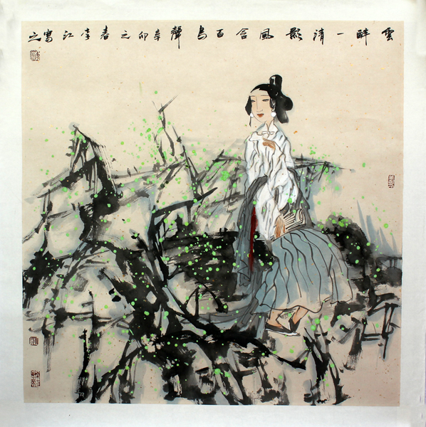 李江的女性人物寫意已有自己的筆墨趣味,她在構圖和色彩上的處理雅致、脫俗,大膽地用筆墨勾畫人物的線條并用沒骨的畫法繪制襯景,卻在極大與極小的對比中襯托出“細”,提煉線條品質,有意地削弱和淡化線條的勾勒,將人物的形體輪廓巧妙地融入墨色之中,使之隨意的滲化為一種富于形式美感的水墨肌理。在賦色上,她將人物造型的適度夸張與色調的情感趨向作了相比,吸收唐施釉法。使色彩與墨色自由融合為一種斑駁而自然的彩釉效果,如真如幻的“光影”,從而使畫面顯得古樸雅致耐看,素凈雅致,華而不俗,給人一種輕松寧靜而又不失沉穩(wěn)深厚的視覺感染力。