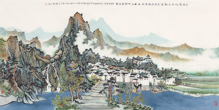 在采訪的過程中,方老師一直在強調中國傳統文化在當代山水畫創作中至關重要的作用。“要想畫好山水,一定要具備深厚的文化基礎和良好的文學功底。古人常說:詩書畫印,四位一體。且不說書與印,很多時候,詩和畫根本是分不開的。這就好像說好詩都有‘詩眼’,也就是讓詩真正能打動人的那個詞;而‘畫’也是有‘畫眼’的,也就是常說的‘點睛之筆’,凝聚了整幅畫的靈魂之所在。”反映在方老師的畫中,既有山川屋舍的全局視角,也有一步一景的點滴細節,無一不是他文人氣度的神妙再現,無一不是其大家風范的最佳注解。