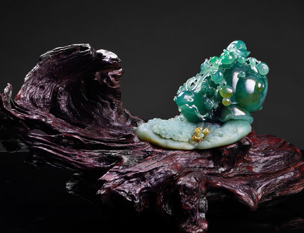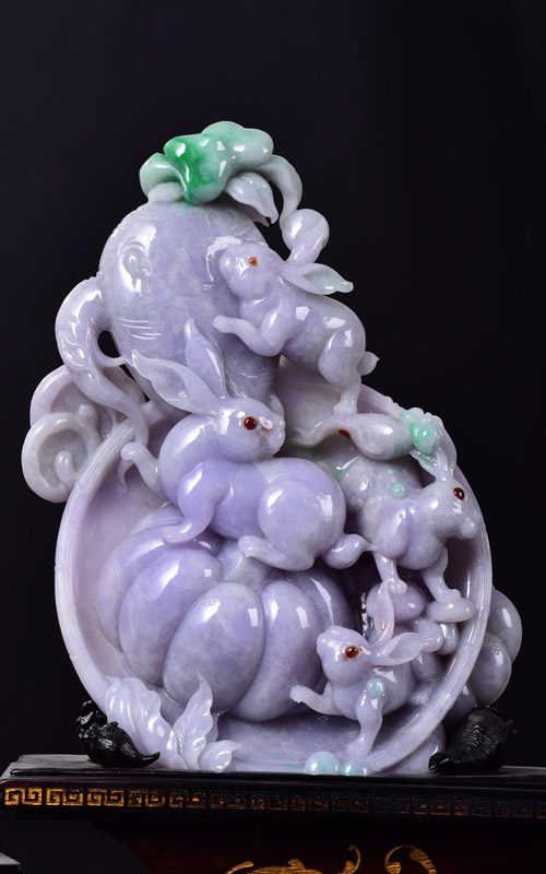 《吐納春秋》: 作品用春帶彩翡翠為原材料,質地細膩,造型生動,難能可貴的是作者把天然紅中帶黑的顏色巧妙地雕刻為十六只玉兔的眼睛,猶如畫龍點睛般生華。每只兔子都動態各異,活潑可愛,身手敏捷,寓意老少身體健康。所獲獎項:2012年中國玉(石)器百花獎金獎; 2012-2013年度肇慶市工藝美術精品展獲“工藝美術精品獎”; 2012年中華玉雕“華表獎”銀獎。