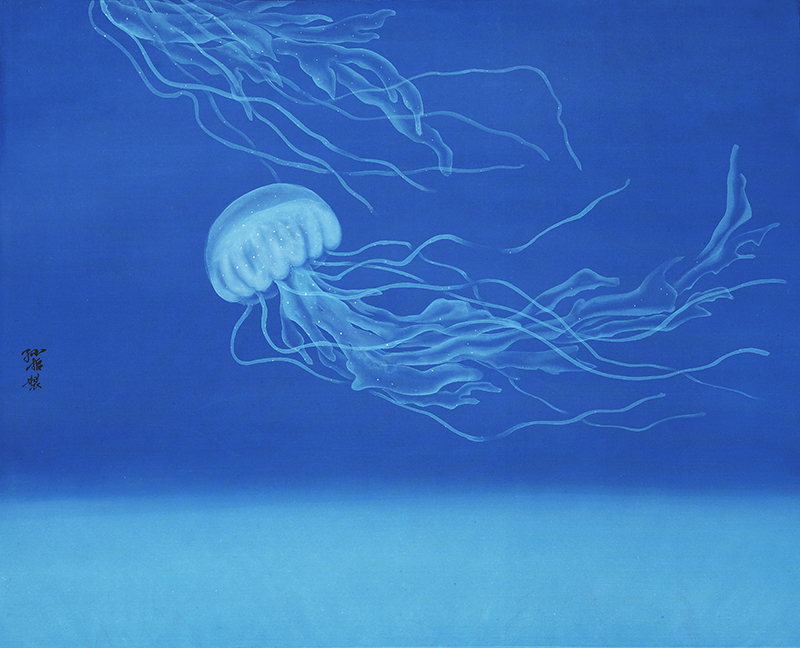 這批作品被張孫哲賦以了“海月令”、“清平調”、“如夢令”、“天凈沙”、“幻夢影”、“萬有引力”等詞名,看得出每一個名字他都特意考量過。“日本人稱水母為‘海月’,海中的月亮,讓人感到特別的夢幻和美,‘令’是一個詞牌名。我以前也畫過很多傳統的國畫,梅花、松樹、竹,當然也有動物,也會取類似《傲雪寒梅》之類的畫名,現在聽著覺得古意太重,反倒被傳統束縛了,但這也是一個過程,沒有之前的知識構架和傳統國畫基礎,也不會有現在這批作品的出爐,我覺得現在的作品才符合自己內心對藝術的表達,也具備了自己的符號語言。”