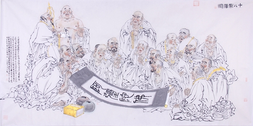 中華民族歷經(jīng)幾千年的櫛風沐雨、滄海桑田,創(chuàng)造了磅礴瑰麗的歷史畫卷,創(chuàng)造了燦爛輝煌的傳統(tǒng)文化,成為中華民族生存發(fā)展的精神食糧。無數(shù)的圣哲先賢,曾大智慧地闡釋了宇宙萬物的普遍規(guī)律;更有古代深刻的思想者,他們的真知灼見閃爍著無盡的人類理性光芒;不可勝數(shù)的文人雅士創(chuàng)作的詩文丹青,內(nèi)蘊著中華民族典雅而獨具特色的文化審美價值;甚至那時的市井平民,在艱苦環(huán)境中展現(xiàn)的樂觀生活情趣,也是這個民族生生不息的精神寫照。正是由于懷著對耳濡目染的傳統(tǒng)道德文化的敬意,鼓動著我用畫筆去表現(xiàn)他們。