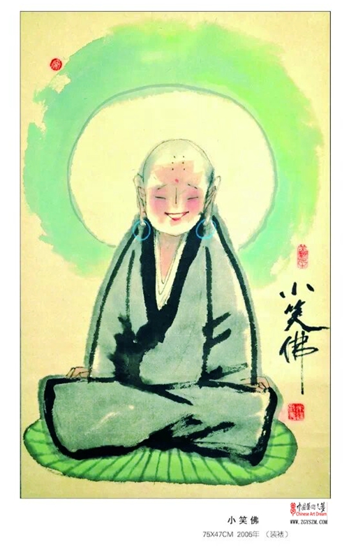《小笑佛》中小佛陀的笑容,似笑非笑,內心難以掩飾的笑容,讓人揣摩,一種苦中有樂,說不清道不明的心理狀態,反映了小佛陀內心世界的燦爛多彩,一首“年紀無大小,悟佛知多少,只要有善心,世界就美好”的打油詩,引發了人們的深層思考。