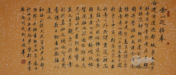 中國書法藝術博大精深,源遠流長,要成就事業,必須苦下功夫。王殿華老師平時公務繁忙,但他仍然在工作余暇專心致志讀帖、臨帖、研帖,一遍遍地臨摹王羲之的《蘭亭序》、懷仁的集王《圣教序》,趙孟頫的《壽春堂記》、《膽巴碑》,以及歐陽詢、米芾、黃庭堅、啟功等古今名家碑帖,爛熟于心,深得要訣。他把握寶貴光陰,研讀了上百余部書法理論專著,吸納古今書法精華,博采眾美。長期修行,師古不薄今,厚積薄發,其作品結構嚴謹,體態俊秀,用筆清朗,章法自然,神采飛揚而不張揚,意韻深厚而不苦澀。幾十年間,王殿華老師書內書外靜心揣摩,從其它藝術門類中汲取精神學養。他創作詩歌、散文、報告文學、小說上百篇,主編《走向世界的中國工程兵》等幾十部著作。文學藝術的修養豐富了他的人生,又夯實了他書法藝術的深厚底蘊;反之,書法藝術的銳進,又促進了文學藝術的深化。