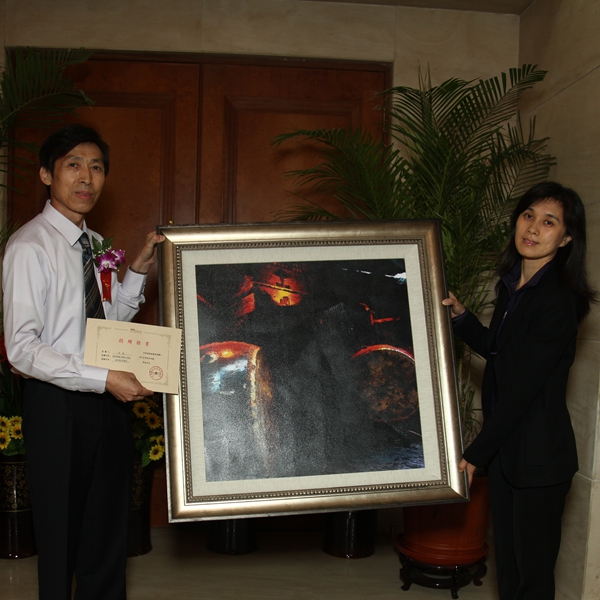 中華世紀壇世界藝術館收藏于江光影平面油畫作品,館長為于江先生頒發收藏證書