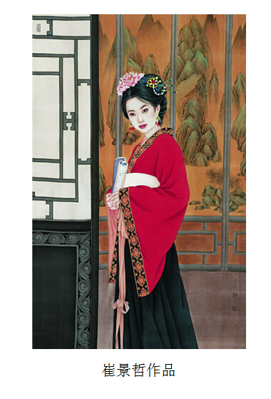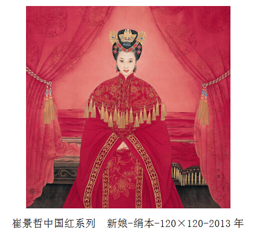2008年,崔景哲于奧運期間在水立方展覽“中國紅”系列作品。“中國紅”系列作品一面世便受到各大藏家的青睞。或手握書卷臨床而立,或斜倚桌角獨自沉思,或端坐于位、盡顯閨秀風范,或雙眸含水、嬌羞待嫁,或輕撫衣裳、活潑盡顯等等神態各異的紅衣古典人物無不折射出他對中國傳統文化的深刻領悟,演繹著他對儒、釋、道文化的圖解,具有十分豐富的藝術想象力和表現力。其作品融入了西方油畫,中國雕塑,壁畫等技法,形成了他淡雅娟秀、立意高古的藝術風格。他在作品中流露出的對藝術執著追求的真誠。因此,他的作品可以感動觀眾,可以引得藏家的追隨。