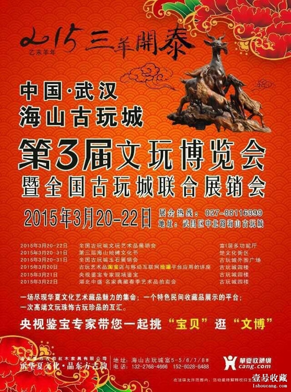 壹號收藏網訊 2015年3月20日——2015年3月31日,中國•武漢第三屆文玩博覽會暨全國古玩城聯合展銷會將在武漢海山古玩城隆重舉行。本次活動包含全國各地民間特色收藏品展示、高端古玩珍寶交易及藝術品交流、鑒寶、拍賣等內容。屆時,民間專業收藏家及來自全國各地的業內500多家高端文玩參展商將到會交流交易,展現華夏文化藝術品魅力。